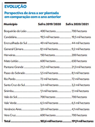 Dos 15 municípios do Vale do Rio Pardo considerados pela Emater/RS-Ascar, em nove haverá crescimento da área plantada de soja, conforme o levantamento realizado sobre a intenção dos produtores. Os destaques são Encruzilhada do Sul e General Câmara, com incremento de 4 mil e 1,1 mil hectares, respectivamente. No total, o acréscimo será de 4,55%.