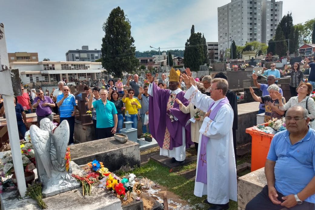 Após a celebração, os religiosos foram até o Cemitério Municipal, para realizar a benção das sepulturas. “Precisamos agradecer pela vida, pelos que aqui estiveram e rezar pela paz”, disse Dom Gílio, aos pés da Cruz Mestre. O local é ponto de oração para mortos que estão sepultados em outros cemitérios.
