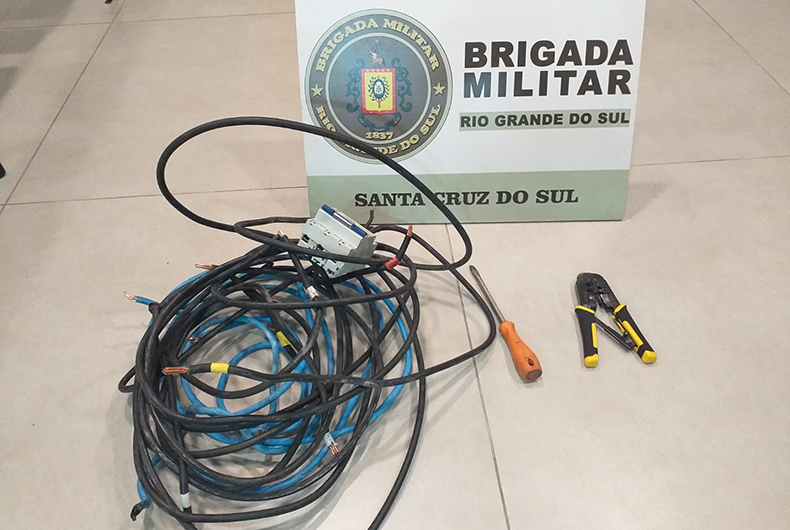 Em revista pessoal foi localizado um alicate, chave de fenda, disjuntor de energia, cabos, além de auxiliares para corte dos cabos de energia. Mais de 7 quilos de fios furtados foram apreendidos. Diante dos fatos foi dada a voz de prisão para os dois suspeitos. O casal foi encaminhado até a delegacia para registro. Segundo informações da Brigada Militar, o homem já tem antecedentes por furto. As identidades dos dois não foram divulgadas.