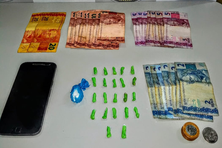 Com eles, foram encontradas 22 pedras de crack – que juntas pesaram 3,3 gramas – e uma porção de 8 gramas de cocaína. Também foram apreendidos R$ 203,50 em dinheiro e um celular. Os dois foram detidos e encaminhados à Delegacia de Polícia, para registro.