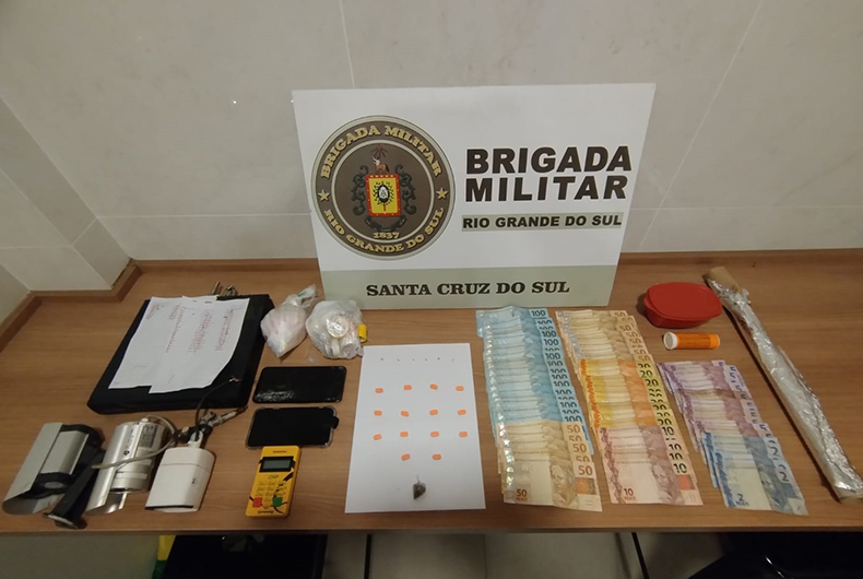 Foram apreendidos R$ 2,6 mil em dinheiro, celulares, uma maquininha de cartão, porções de crack, uma porção de maconha, 16 comprimidos de ecstasy, câmeras de monitoramento, anotações de tráfico, além de apetrechos para embalar droga.