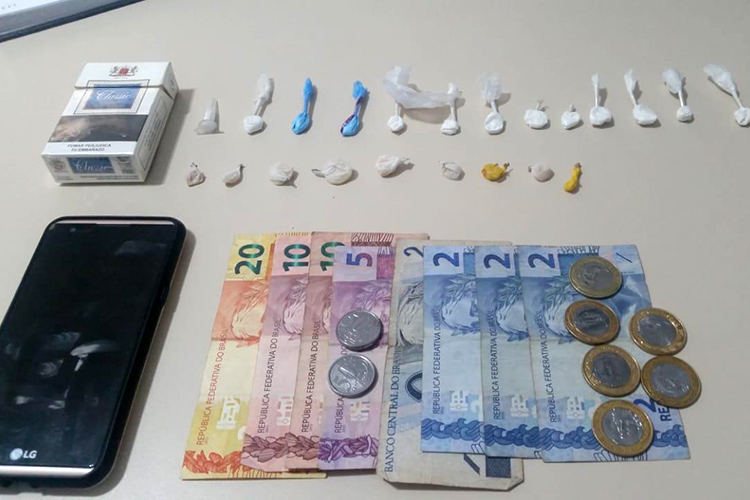 Foram apreendidos 13 envólucros de cocaína, nove pedras de crack, e R$ 60,00 em notas diversas