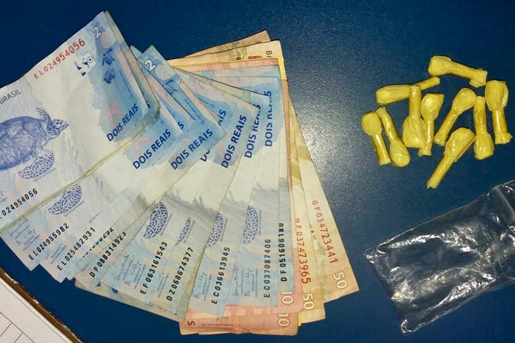 Com o homem foram encontradas e apreendidas 10 buchas de cocaína e R$ 168. Ele foi preso em flagrante e encaminhado para registro na Delegacia de Polícia.