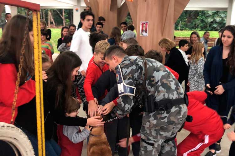As crianças assistiram uma demonstração de como os cães são adestrados e receberam explicações sobre as atuações dos animais, que são empregados em abordagens e em ocorrências policiais envolvendo faro de pessoas e de entorpecentes. Também ouviram atentamente que os cães obedecem às ordens policiais desde filhotes e só atacam quando comandados.