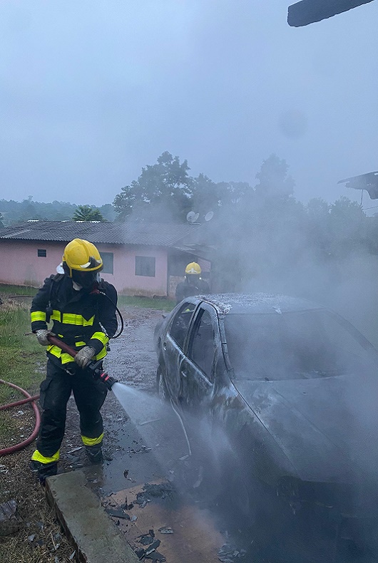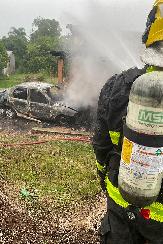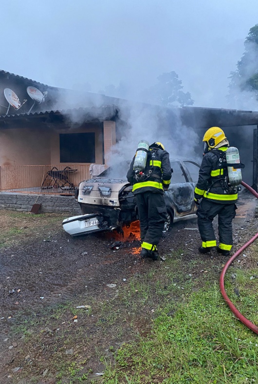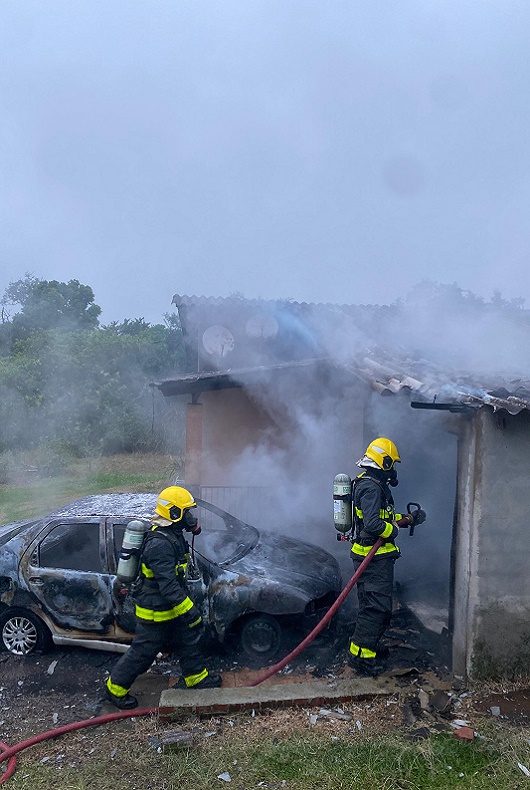 Os bombeiros instalaram duas frentes de trabalho: uma equipe realizava o combate às chamas e outra protegia a residência do fogo, evitando que se alastrasse ainda mais. O incêndio destruiu o carro e danificou a garagem da casa. A residência, no entanto, foi preservada.
