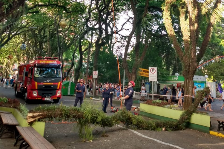 Os Bombeiros realizaram o procedimento seguro para retirada do galho, mas a queda não chegou a machucar ninguém nem causar nenhum dano. Como havia risco, a via foi interditada porque havia muitas pessoas circulando pela área no momento. Não chegou a haver desligamento de energia no local.