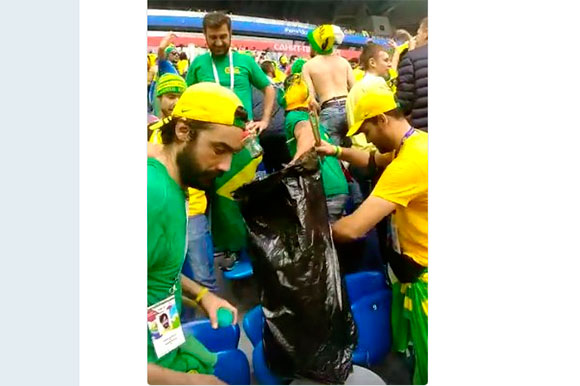Os torcedores brasileiros na Rússia seguiram o exemplo de japoneses e senegaleses nesta sexta-feira, 22. Após o termino da partida entre Brasil e Costa Rica pela Copa do Mundo, eles pegaram um grande saco plástico e recolheram o lixo no setor onde estavam na Saint Petersburg Arena.