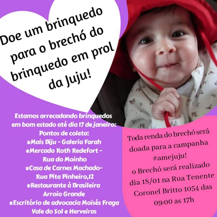 No dia 18 de janeiro ocorre mais uma ação em prol da pequena Júlia Cardoso Torres, de dez meses: um brechó de brinquedos. A Juju é moradora de Santa Cruz do Sul e tem Atrofia Muscular Espinhal (AME) tipo 1. A família busca arrecadar R$ 9 milhões para custear um tratamento inovador feito nos Estados Unidos.