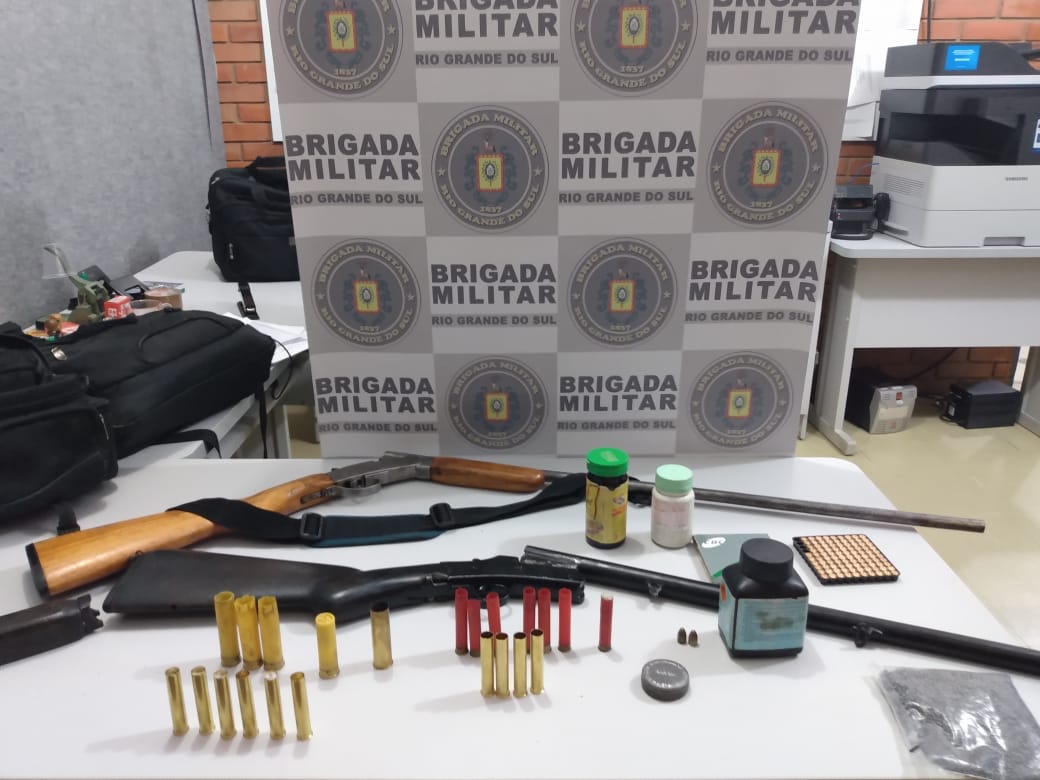 Policiais da Patrulha Comunitária do Interior (PCI) realizavam patrulhamento ostensivo quando abordaram um veículo Logan conduzido por um homem, de 54 anos, e na carona estava outro homem, de 56 anos. Durante a busca no veículo, os brigadianos encontraram duas espingardas sendo uma calibre . 20 e outra, artesanal, de calibre .36.