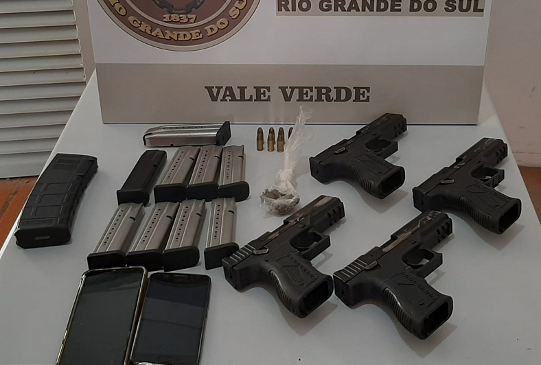 Policiais militares prenderam dois homens na Rua Beno Schuch, no Centro de Vale Verde, no fim da tarde desta segunda-feira, 6. A abordagem ocorreu por volta das 17h25, quando a guarnição realizava a Operação Papai Noel. Um homem foi visualizado caminhando com um volume aparente na cintura. O suspeito, de 30 anos, passou por revista e, com ele, foi localizada uma pistola 9 milímetros carregada com sete munições.
