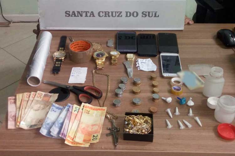 Com o auxílio do Pelotão de Operações Especiais (POE), foi feita revista no pátio e na casa. No local, foram apreendidos R$ 378,80 em notas diversas, cinco relógios, uma corrente e bijuterias, quatro celulares. Ainda foram encontrados sete pinos de cocaína e três buchas da mesma droga.