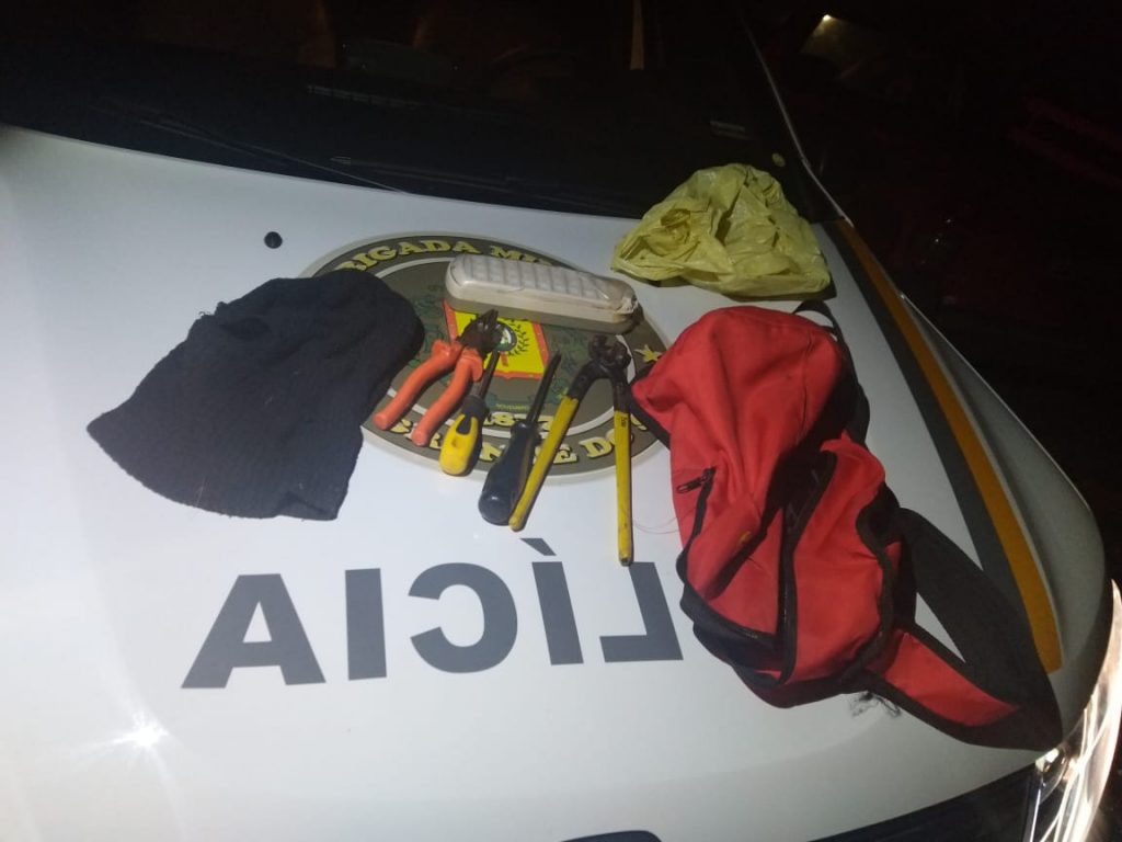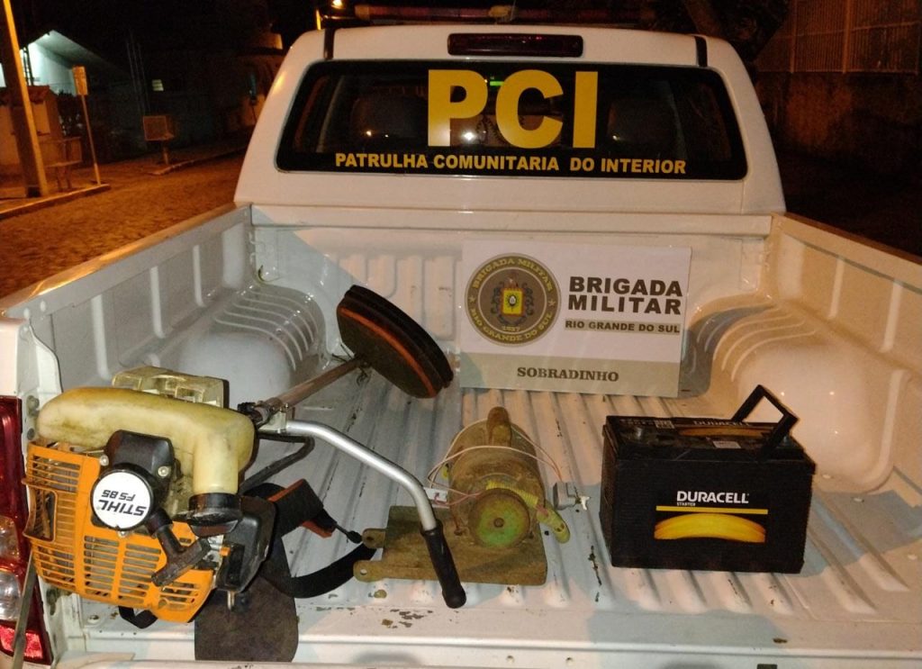 Também, na Localidade de Campo de Sobradinho, interior de Passa Sete, foi abordado um veículo camionete Corsa de cor vermelha, sendo que a mesma transportava vários objetos sem procedência, tais como: roçadeira costal, bateria de trator, motor elétrico, touca ninja, várias ferramentas como alicate, torquês e chaves de fenda. Um dos ocupantes do veículo possui registros de ocorrência por furto qualificado na região Centro Serra. O referido veículo foi recolhido ao depósito do Detran por estar com o licenciamento vencido. Os objetos, assim como os dois ocupantes do veículo foram apresentados na Delegacia de Polícia para registro da ocorrência.