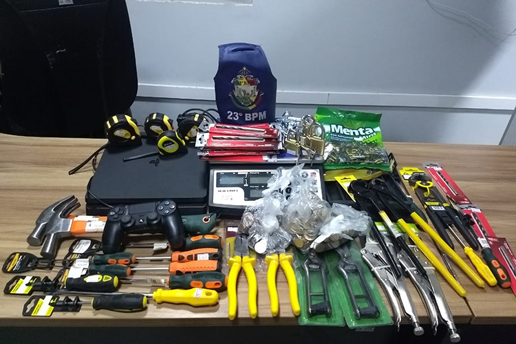 O homem carregava um saco grande e quando percebeu a presença da Brigada deixou os pertences no local e fugiu. Na sacola foram encontrados um alicate, um cortador de poda de árvores, um playstation, a quantia de R$ 165,00 em moedas e outros itens.