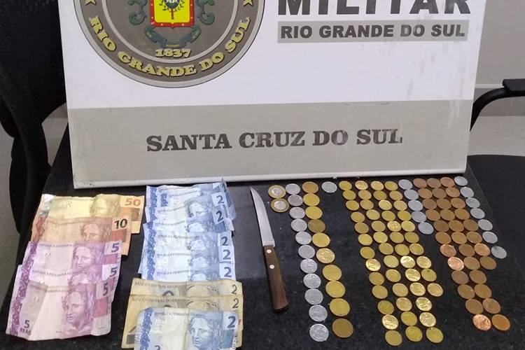 Na sequência, policiais militares localizaram o suspeito em um banheiro no Parque da Oktoberfest. Com ele foi encontrada e apreendida a quantia em dinheiro levada no crime e uma faca. Ele foi detido e encaminhado para registro na Delegacia de Polícia de Pronto-Atendimento (DPPA).