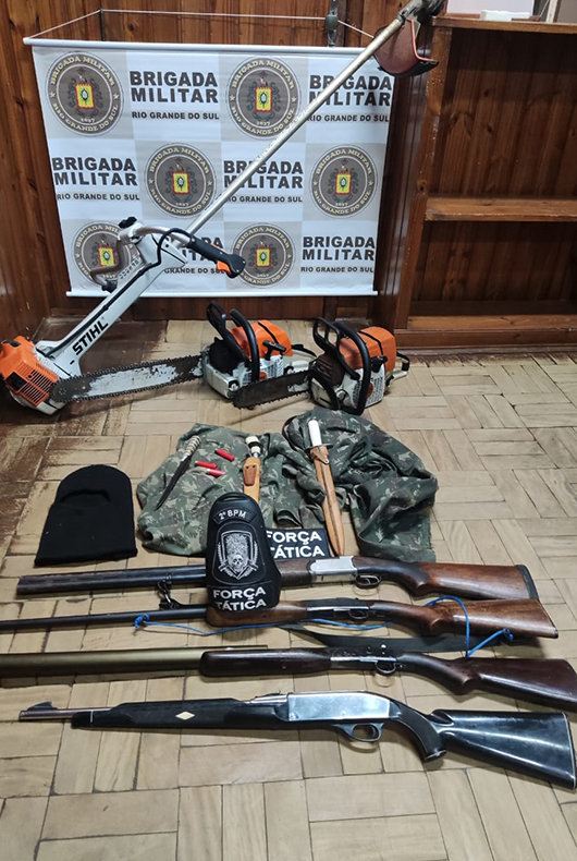 “Ele nos indicou onde havia vendido alguns dos produtos roubados. Fomos até esse local e encontramos as armas, que estavam em situação de furto, a motoserra e a roçadeira. O homem que estava nessa casa também foi capturado”, complementou o comandante do 2º BPM. Os dois suspeitos foram presos em flagrante e apresentados na Delegacia de Polícia de Encruzilhada do Sul. Nomes e idades foram mantidos em sigilo pelas autoridades policiais.