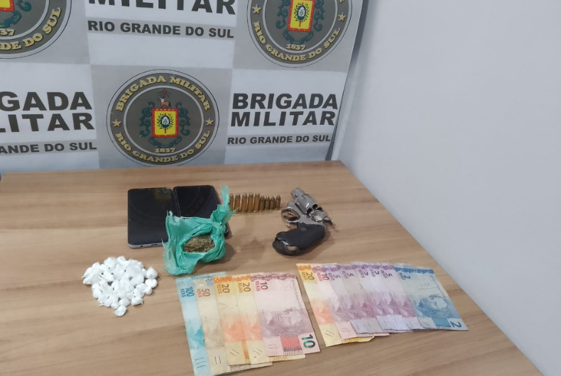 Ao ser dada voz de parada, o homem correu para os fundos de uma residência. Os policiais o acompanharam e conseguiram detê-lo. Com ele, foi localizado um revólver calibre 38 com cinco munições, além de um bolsa, contendo R$ 257,00 em moeda corrente, 46 buchas de cocaína, uma porção de 25 gramas de maconha, dois celulares e munições de calibre 380 e 9 milímetros.