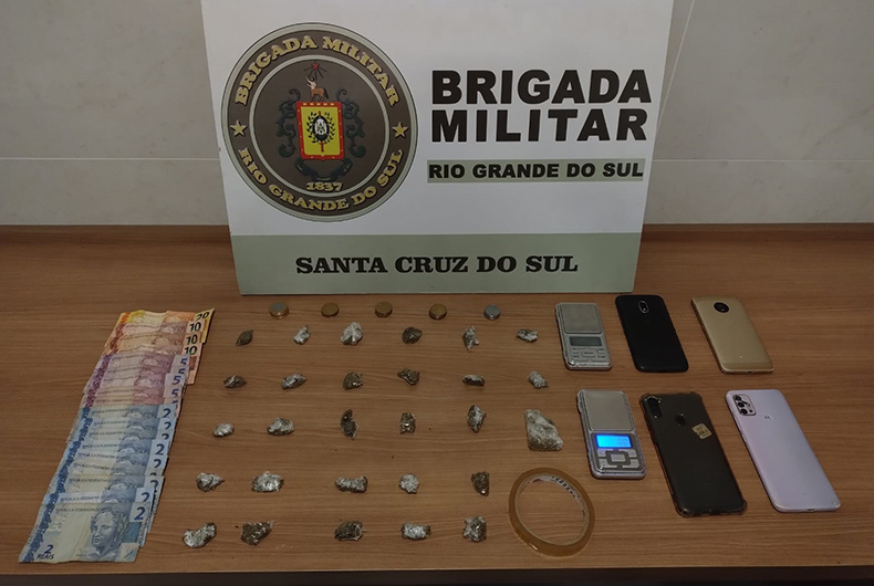 Na madrugada deste sábado, 23, durante ações de policiamento no Bairro Santa Vitória, em Santa Cruz do Sul, uma guarnição da Brigada Militar avistou dois suspeitos em frente a um conhecido ponto de tráfico de entorpecentes. Foi realizada a abordagem e com um homem de 18 anos foram localizadas 28 porções de maconha (35,2 gramas) e R$ 104,00. No local ainda foram encontrados quatro celulares e duas balanças de precisão.