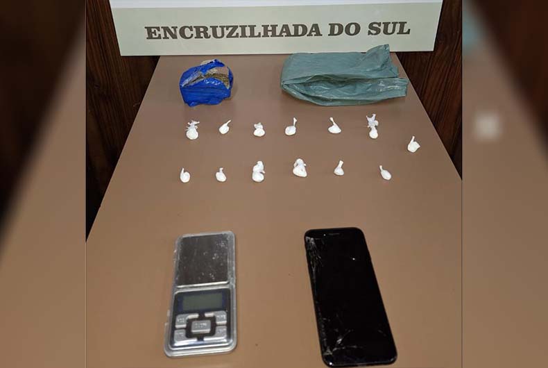 Ao perceber a presença dos policiais, o suspeito tentou fugir, mas foi alcançado logo em seguida. Em busca pessoal foi encontrada uma sacola contendo 13 buchas de cocaína, um tablete de maconha, uma balança de precisão e um celular. Ele foi preso em flagrante e conduzido à Delegacia de Polícia para o registro da ocorrência.