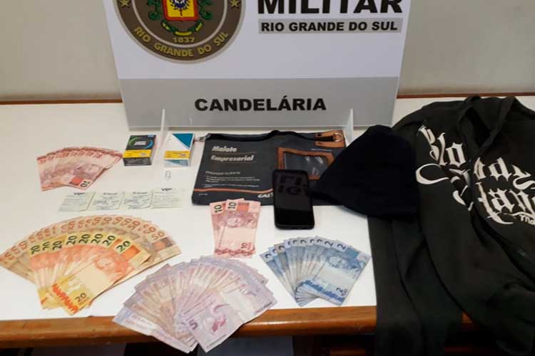 Eles foram localizados com R$ 1.435,00, quatro comprovantes de cartão de crédito pertencentes ao estabelecimento e duas carteiras de cigarro. Além disso, foram apreendidos uma touca ninja, um malote e um moletom usado no crime. Os dois foram presos em flagrante e levados para a Delegacia de Polícia para registro do caso.