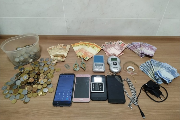 Ao todo, foram apreendidos R$ 1.121,45, duas porções de crack, pesando 9,9 gramas, duas balanças de precisão, uma gilete, duas fitas durex, uma corrente prateada, um cordão dourado, quatro celulares e um carregador.