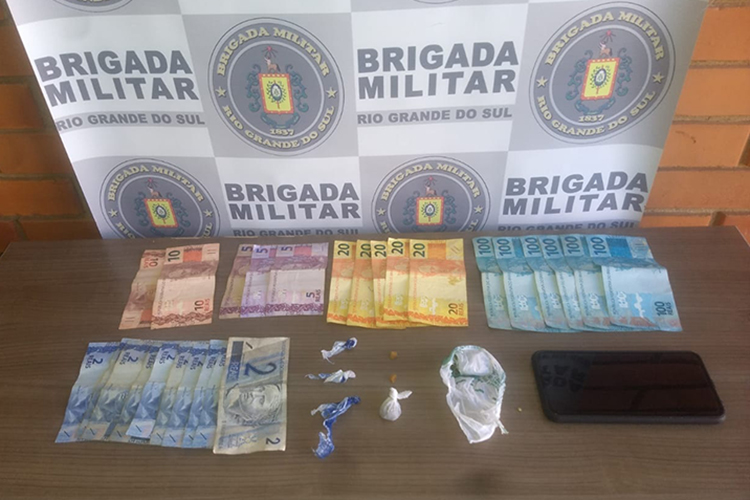Durante o patrulhamento de rotina os brigadianos receberam uma denúncia de que havia um indivíduo traficando no local. Ao realizar a averiguação, a guarnição realizou a abordagem do suspeito e durante busca pessoal localizou duas porções de maconha, cinco pedras de crack e R$ 757,00 em dinheiro.