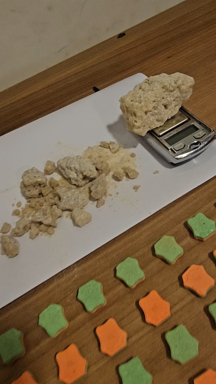 Durante a abordagem, o suspeito foi flagrado com uma grande quantidade de drogas sintéticas, além de materiais utilizados para fracionamento e venda. Ao todo, foram apreendidas 1.620 porções de ecstasy, o equivalente a cerca de 1,27 quilo, além de uma porção de MDMA, aparelhos celulares e uma balança de precisão.