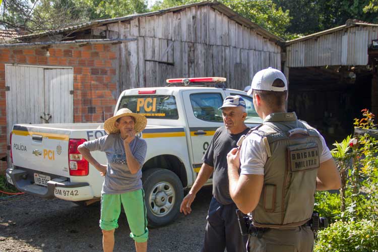 Mais adiante, em Linha Pinheiral, a BM visitou um casal de agricultores vítimas de casos recentes de abigeato, Geraldo e Marli Gais, ambos de 62 anos. Há cerca de três semanas, criminosos furtaram quatro cabeças de gado da propriedade da família.