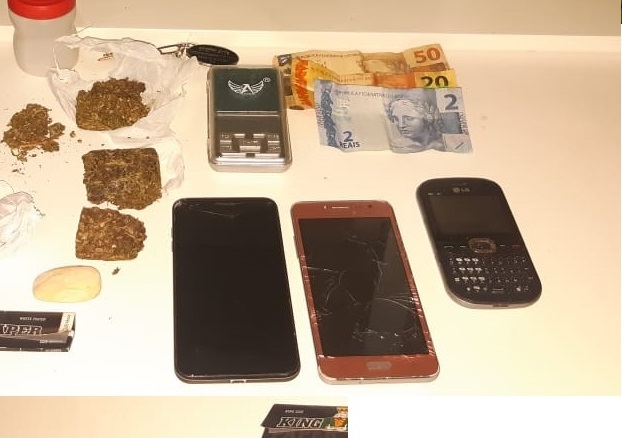 Policiais militares realizaram a abordagem de um veículo com dois homens. Durante busca foi encontrada no interior do veículo uma balança de precisão, além de 18 gramas de cocaína, 76, 4 gramas de maconha e três aparelhos celulares.
