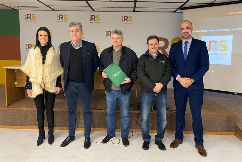 Presidente da Junta Comercial, Industrial e Serviços do Rio Grande do Sul (JucisRS), Lauren de Vargas Momback; Edson Brum; vice-presidente do Badesul, Kalil Sehbe; superintendente da agência do Rio Grande do Sul do BRDE, Alsones Balestrin; e secretário do Desenvolvimento Econômico Adjunto, Joel Maraschin | Foto: Ascom Sedec/RS