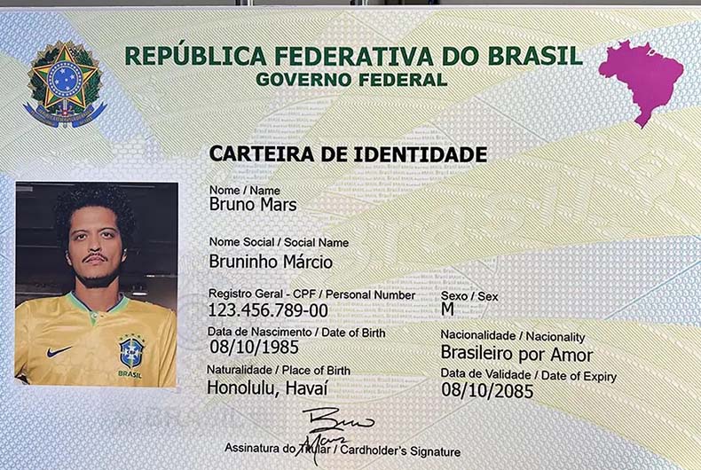 Bruno Mars, nome artístico de Peter Gene Hernandez, recebeu o documento figurativo – confeccionado em uma gráfica da capital mineira. A impressão traz até o nome social Bruninho Márcio; data de nascimento; um número fictício de Cadastro de Pessoa Física (CPF); data de nascimento, em 1985; local de nascimento, em Honolulu, no estado do Havaí (Estados Unidos); e validade até 2085 [foto em destaque].
