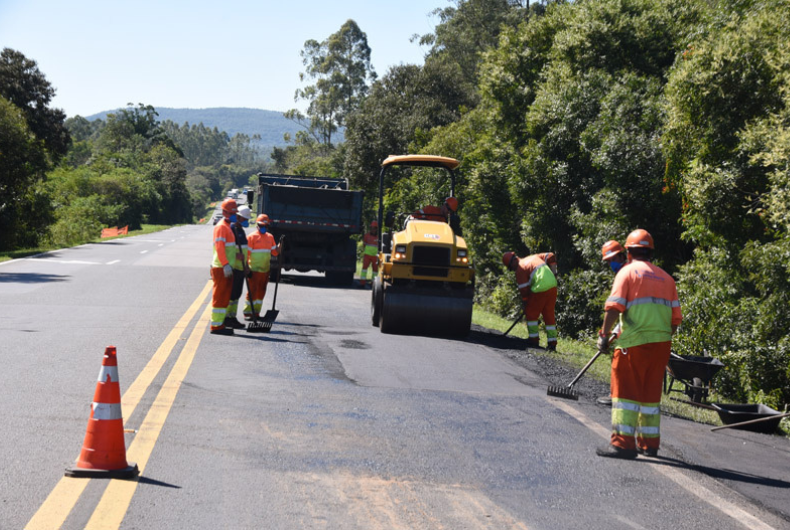 Em um dos pontos onde havia buracos na região de Taquari, equipes da concessionária trabalhavam na recuperação do asfalto