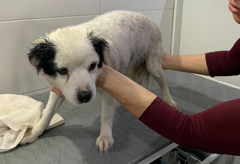 O animal de pequeno porte é branco com as orelhas pretas, é dócil e está bem cuidado.