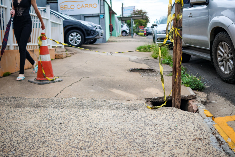 Um buraco na calçada na Rua São José, em frente a um restaurante, está preocupando comerciantes locais e cidadãos que circulam diariamente pelo local. Além do risco que o problema apresenta no Bairro Goiás, em Santa Cruz do Sul, verificou-se que a estrutura sofreu erosão subterrânea, restando apenas a laje em concreto, que pode se romper a qualquer momento.