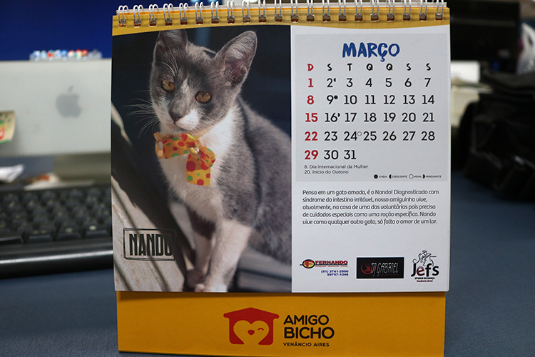 Raposinho, Nando e Guido são alguns dos animais que ilustram o calendário confeccionado pela ONG Amigo Bicho, de Venâncio Aires. O material, que foi criado em parceria com 34 empresas e três colaboradores físicos, traz fotos e pequenos textos com as histórias de alguns dos gatos e cachorros resgatados pela entidade – em parte já adotados e outros à espera de um lar.