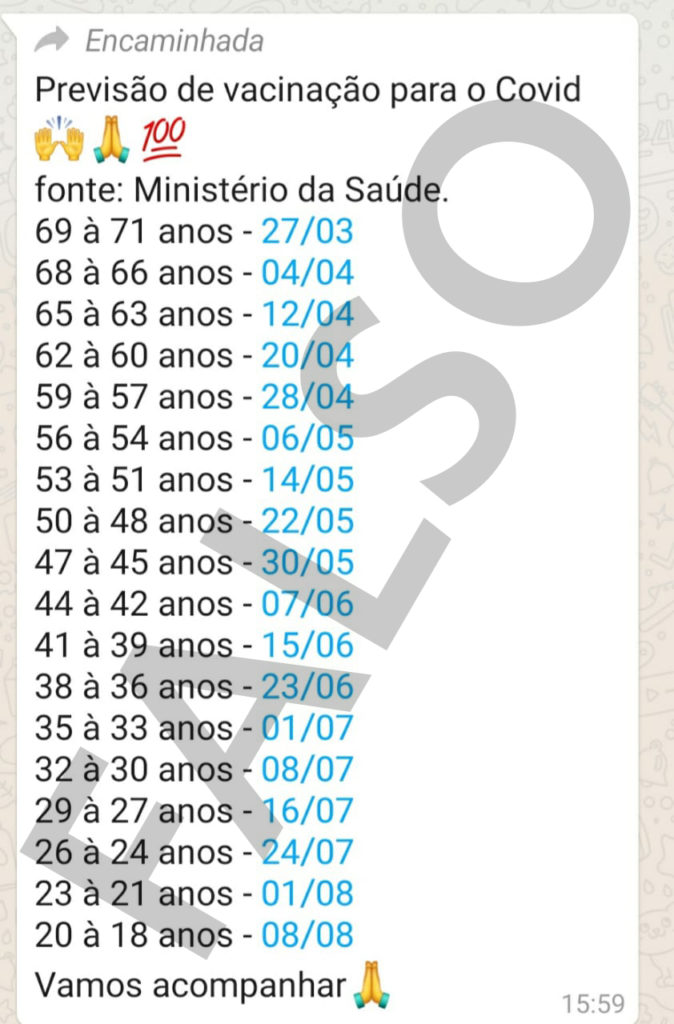 Os dados, porém, são falsos e não devem ser compartilhados para não gerar desinformação. A secretária de Saúde de Santa Cruz, Daniela Dumke, confirmou à Gazeta do Sul que não há qualquer projeção oficial nesse sentido. As datas da campanha de vacinação, bem como o público-alvo, são definidos de acordo com as remessas de doses que são repassadas aos estados e municípios. “A partir da chegada de cada lote, recebemos novas orientações de grupos e quantitativos”, explicou.