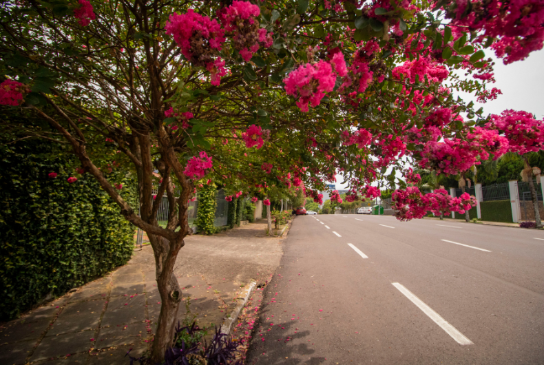 O rosa chama mais a atenção, mas a árvore também pode exibir o branco e o lilás. A extremosa é símbolo de Santa Cruz desde 1972