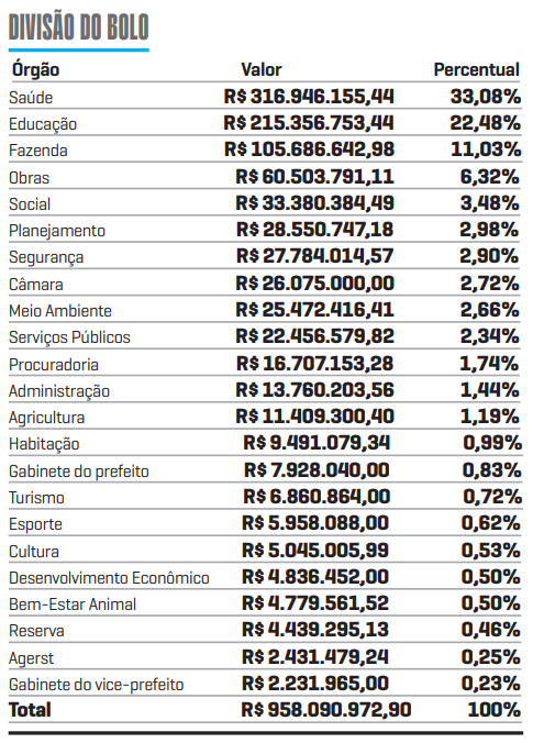 Entre os textos avaliados pelos vereadores estava a LOA, que prevê orçamento de R$ 958.090.972,90. Desse total, 33,08% são destinados à Saúde, tentando minimizar a situação registrada neste ano, em que houve problemas orçamentários na pasta. Outros 22,48% foram para a Educação. As duas pastas que mais recebem recursos superam 55% das receitas previstas para o próximo ano.