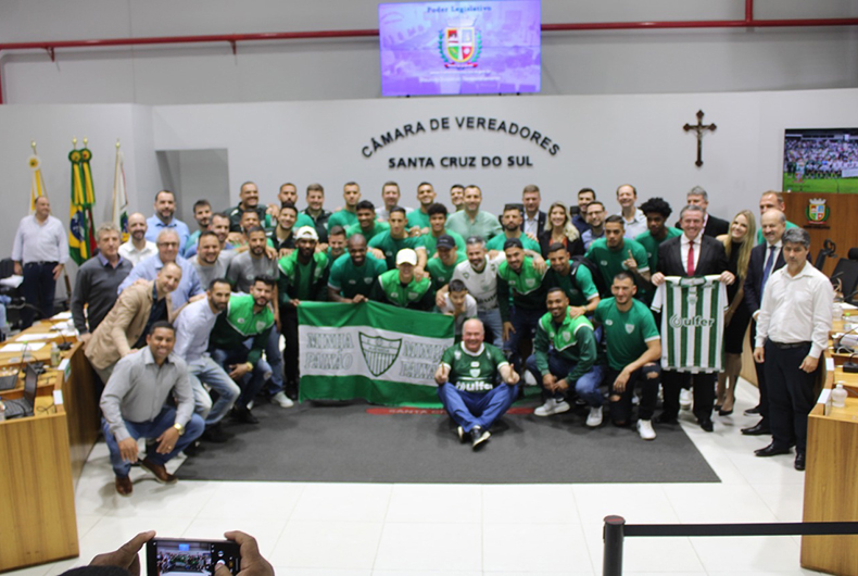 Após a conquista do acesso à elite do futebol gaúcho no último domingo, 10, os atletas do Esporte Clube Avenida foram homenageados nesta semana na Câmara de Vereadores de Santa Cruz do Sul. Devidamente trajado com a camisa alviverde, o vereador Jair Eich (Progressistas), que é presidente do clube, fez um pronunciamento emocionado na tribuna, no qual citou todos os integrantes da equipe, comissão técnica e diretoria.