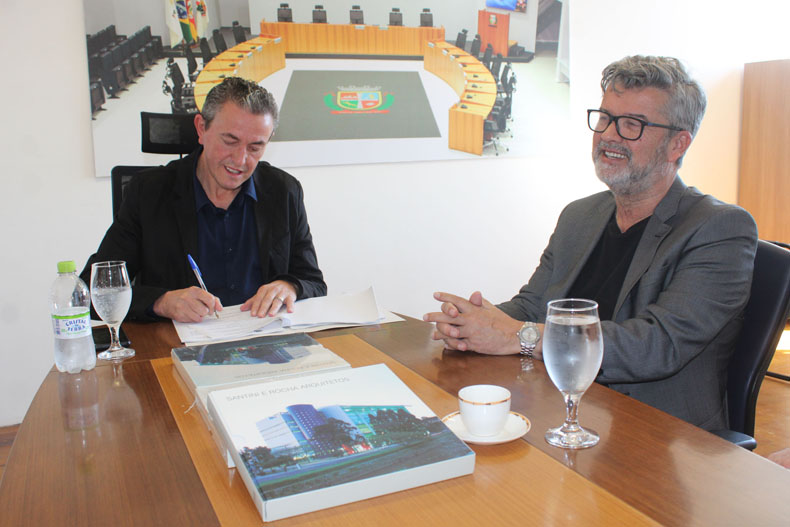 Foi assinado nessa quinta-feira, 18, o contrato entre a Câmara de Vereadores e a empresa Santini & Rocha Arquitetos, para a elaboração dos projetos de construção da nova sede do Legislativo. O presidente Gerson Trevisan frisou que o momento é mais um capítulo importante na história da Câmara. “Estamos dando mais um passo rumo à nossa nova sede do Poder Legislativo. Temos a certeza de que a empresa possa nos apresentar um projeto que contemple as necessidades deste poder e também da população”, afirmou.