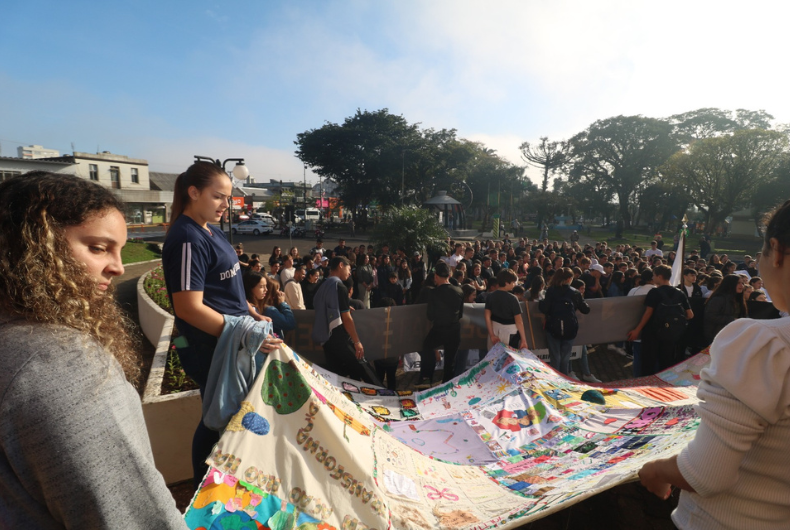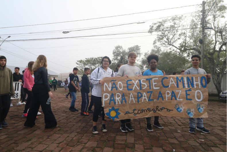 O movimento pela paz é realizado desde 2005. Foi interrompido em 2019 em virtude da pandemia, e retomado com a edição deste ano. O ato também marcou os 11 anos de atuação da Comissão Interna de Acidentes e Violência (Cipave), nas escolas de 30 municípios. Para o assessor da União dos Estudantes, André Henckes, foi um momento para celebrar e agradecer. “Temos que enaltecer o trabalho das instituições de segurança em nossas escolas.”