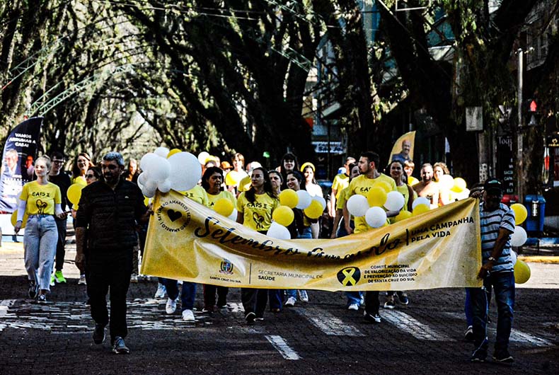 Trajando camisetas amarelas, portando balões e cantando músicas com mensagens de positividade, um grupo de cerca de 40 pessoas, entre profissionais da saúde, usuários do Centro de Atenção Psicossocial (Caps) e familiares, percorreram na tarde desta terça-feira, 17, a Rua Marechal Floriano para lembrar que saúde mental precisa de cuidados. A Caminhada pela Vida é uma das atividades que integra a programação do Setembro Amarelo, mês de prevenção ao suicídio.