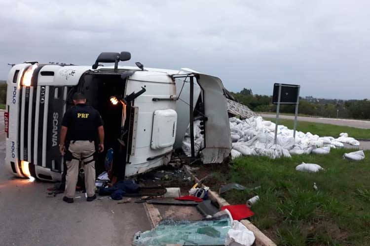 Conforme a PRF, o motorista teve ferimentos e foi encaminhado para o Hospital Regional de Rio Pardo, com suspeita de fratura no braço e um corte na cabeça. Parte da carga de sacos de adubo ficou espalhada pela pista.