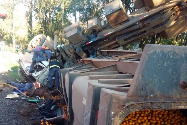 Um caminhão Mercedes-Benz carregado com laranjas tombou na tarde desta segunda-feira, 13, na ERS-324, entre Passo Fundo e Marau, no Planalto Norte. O veículo, com placas de Aberlardo Luz, perdeu o controle em uma curva e capotou.