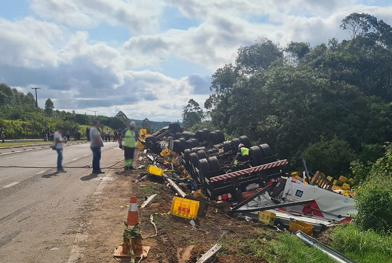 Um caminhão carregado de cerveja tombou na RSC-287. O acidente aconteceu na manhã desse domingo, 16, no Trevo de Taquari, na altura do quilômetro 36 da rodovia.