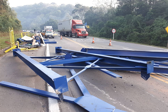 As estruturas metálicas se espalharam na rodovia, cobrindo duas das três pistas no trecho. Os policiais estimam que a carga pese cerca de duas toneladas. Um guincho fez a retirada das peças por volta das 9 horas.