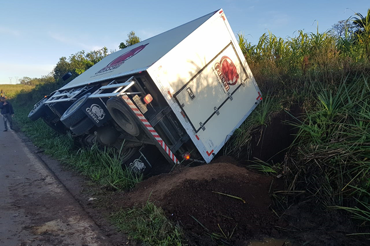Um caminhão do frigorífico Gassen sofreu uma saída de pista e acabou tombando na lateral da via. O condutor e o caroneiro não ficaram feridos. O trânsito não chegou a ficar interrompido no local. O caminhão foi removido do local por volta das 9 horas.