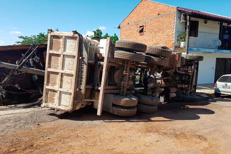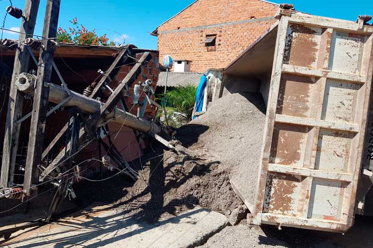 Um caminhão carregado de britas tombou na manhã desta quarta-feira, 19, no Bairro Faxinal Menino Deus, derrubou um poste de energia elétrica e atingiu o portão de uma residência. O caso aconteceu por volta das 9 horas na Rua Presidente Hermes da Fonseca.