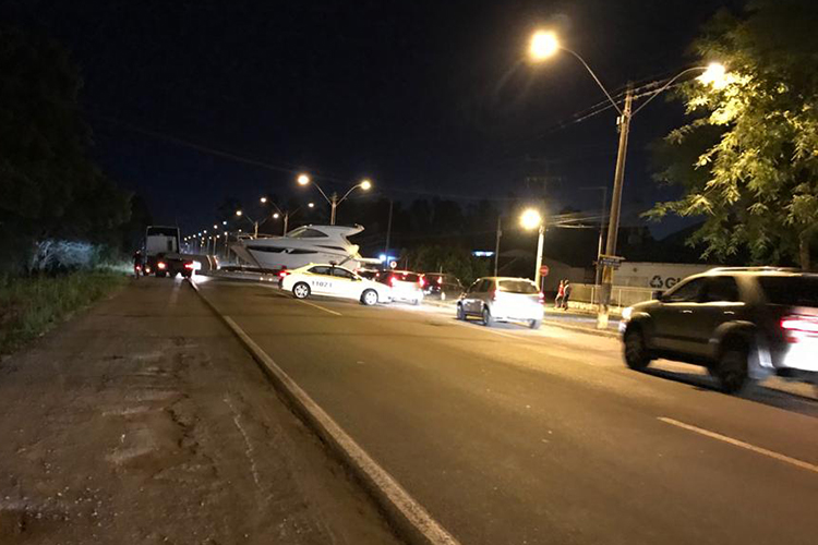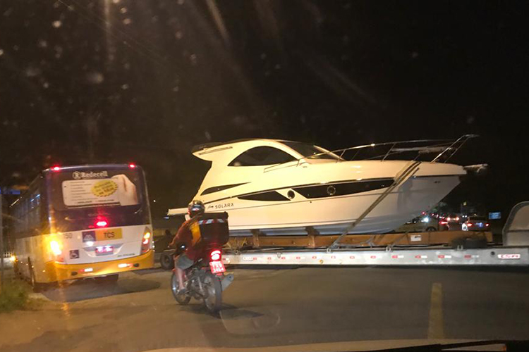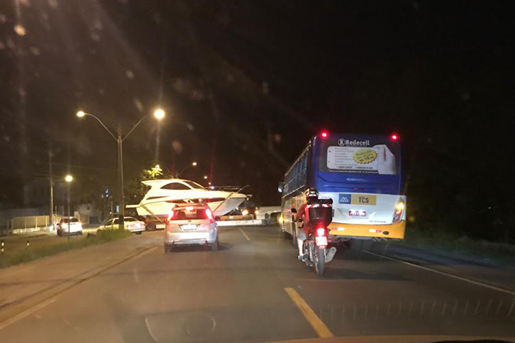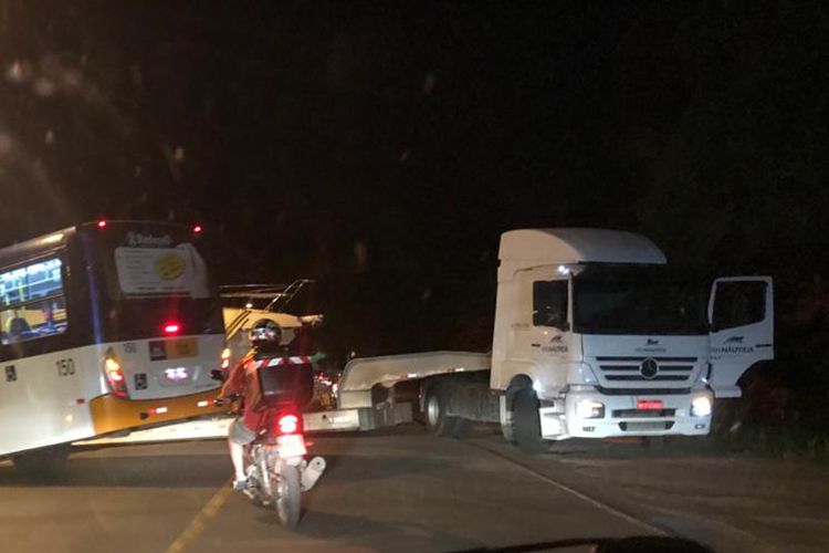 O condutor da carreta tentava manobrar o veículo, que estava transportando um barco, para atravessar a pista quando acabou ficando trancado na Avenida Castelo Branco.