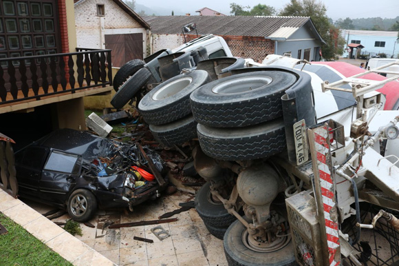 Um acidente de trânsito envolveu dois caminhões da Conpasul carregados com concreto na manhã deste sábado, 5, em Monte Alverne, no interior de Santa Cruz do Sul. A batida aconteceu por volta das 8 horas no trevo de acesso ao município. Um dos caminhões perdeu o freio na descida e acabou empurrando o outro, que seguia na frente. Ambos acabaram caindo dentro dos pátios das casas.