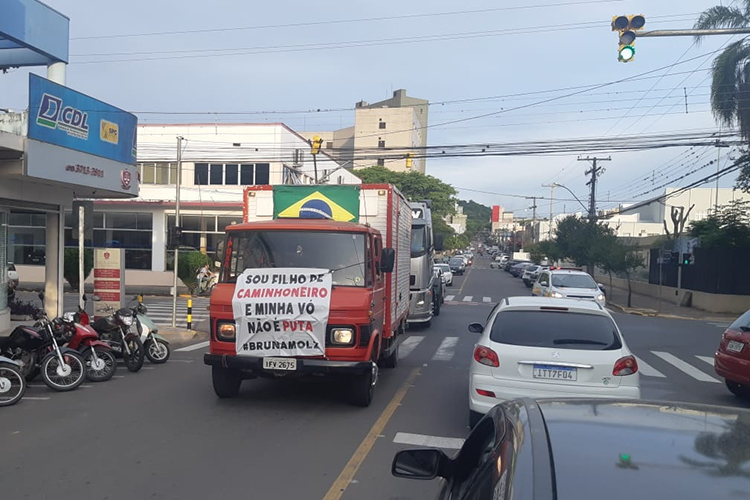Os cinco caminhões e alguns carros receberam cartazes com os dizeres “#ForaMolz” e “Bruna! Respeite o povo, pede pra sair” e percorreram as vias buzinando. Um dos veículos levava um touro mecânico coberto por um guarda-sol. Participam também mulheres e crianças.